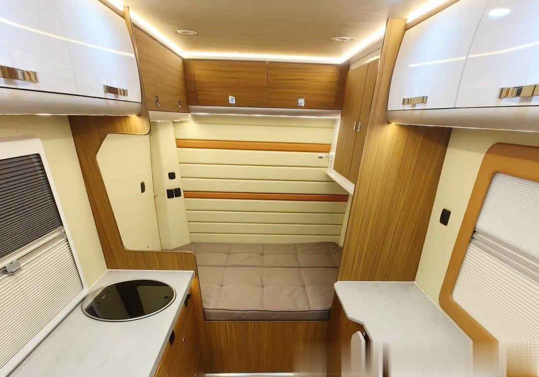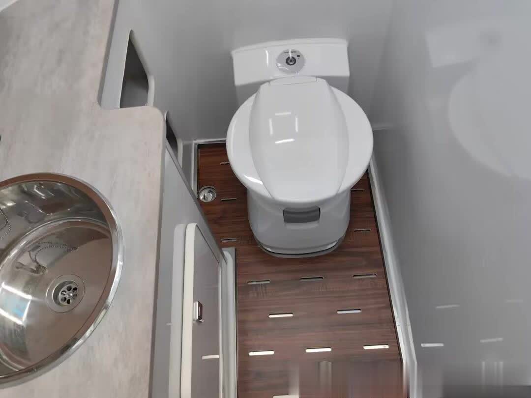 后部是一张休息的双人大床,上部则设计有储物柜以及封闭式吊柜。客厅两侧安装有宽大的房车专用外推窗,满足日常房车的采光和透气的需要。内置防蚊纱窗以及隐私百叶窗。前置独立卫浴间配有进口抽拉式马桶(可选生物降解马桶)、不锈钢洗脸盆、淋浴花洒、双向换气扇等。水电方面,配有100-200L净水箱、60L灰水箱,5度电、3000W逆变器、400W太阳能电池板。冷暖系统包括进口顶置冷暖空调以及5000W柴油暖风。值得一提的是该车可选48V电路系统。