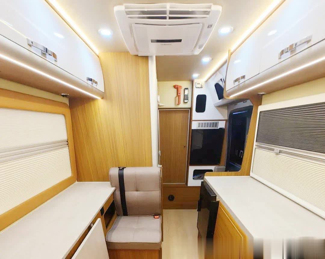这台考斯特房车内饰布局并不常见但很有特色,首先它并非前后通透式布局,隐私性非常好。驾驶舱与后部生活区设计有隔断,可通过一扇小门进入,并采用前置卫浴间的设计,生活区整体性强。客厅两侧打造有多功能柜子,储物空间非常丰富。且一侧的柜子可拓展,配有内嵌式车载冰箱、不锈钢水槽,中部是通道,活动空间大,且只配了一张沙发座椅(带三点式安全带),加上主副驾座椅该车共核载3人。